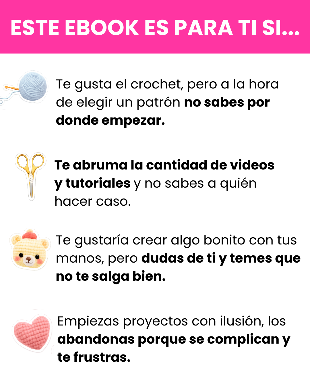 No. Este ebook está pensado para principiantes o cualquier nivel. Si eres nuevo en esto, empiezas desde cero y vas paso a paso hasta crear tu primer amigurumi sin perderte.